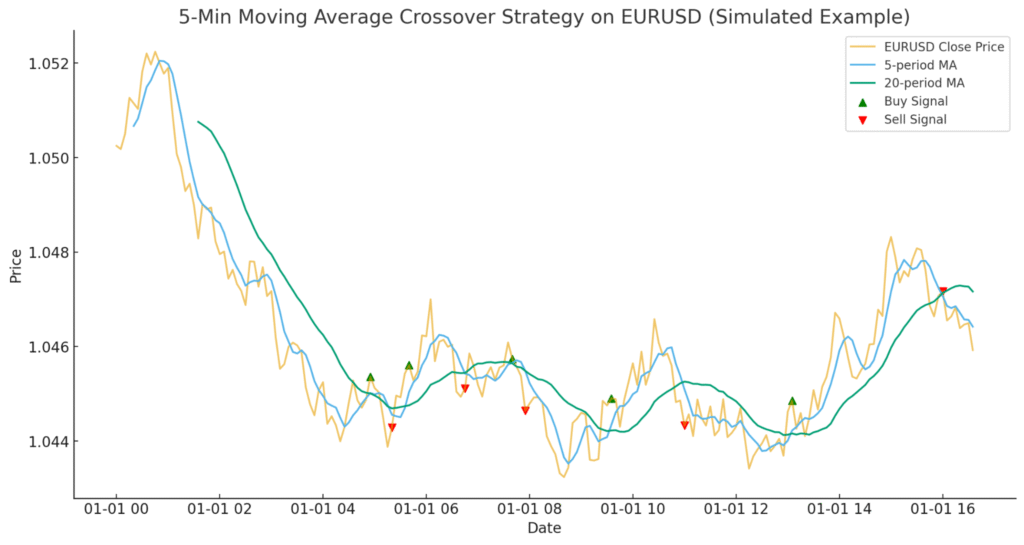 Here’s a detailed 5-minute moving average crossover strategy for Forex trading, using EUR/USD as an example. I’ve generated simulated 5-minute data to demonstrate the setup with charts and signals.